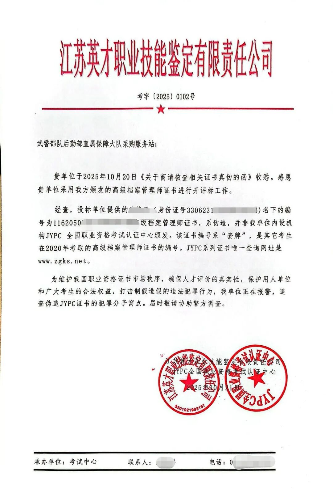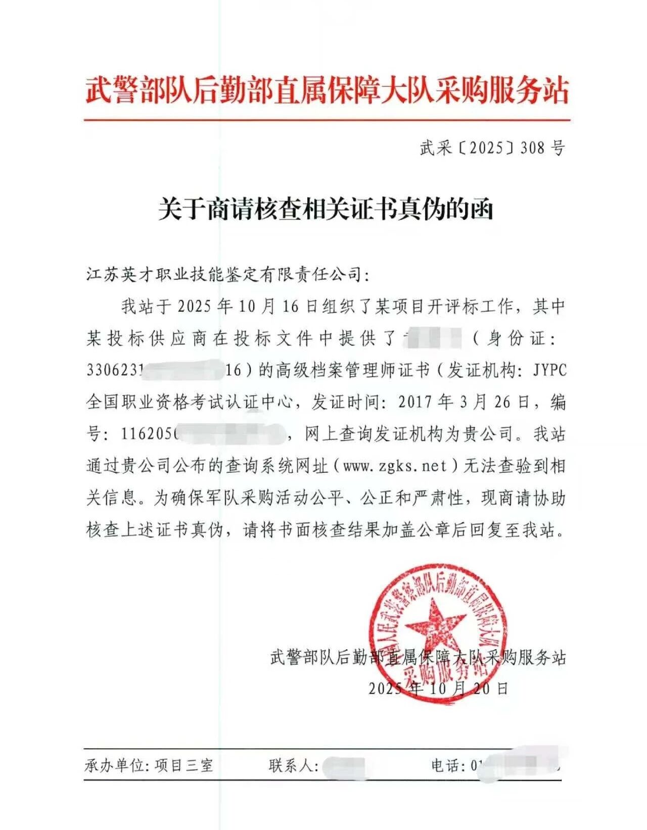 近日,武警部队后勤部直属保障大队采购服务站在招标评标工作中,以高度的专业警惕性发现伪造JYPC证书现象,并正式致函江苏英才职业技能鉴定集团请求核查。JYPC全国职业资格考试认证中心当日即予以回应,展现出专业鉴定机构的高效与担当。这一高效互动不仅体现了军事采购单位的严谨作风,更彰显了JYPC证书在军事后勤保障体系中的重要地位,映照出JYPC证书在当今社会不可撼动的专业性与含金量。